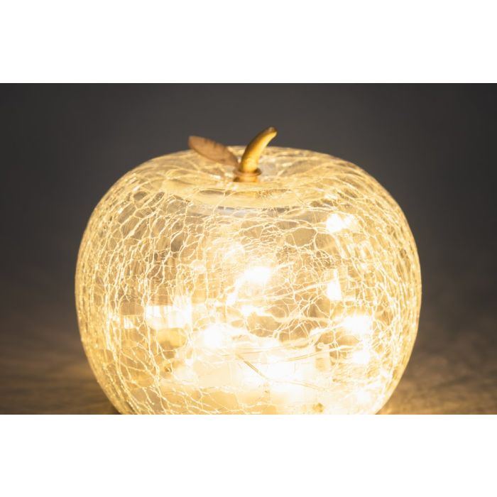 Skaists dekoratīvs ābols, kas izgatavots no caurspīdīga stikla. Ābola iekšpusē ir 10 silti baltas LED gaismiņas. Taimera funkcija: 6 stundas ieslēgts/18 stundas izslēgts. Baterijas: 3 x AAA (nav iekļautas komplektā). Lietošanai iekštelpās.