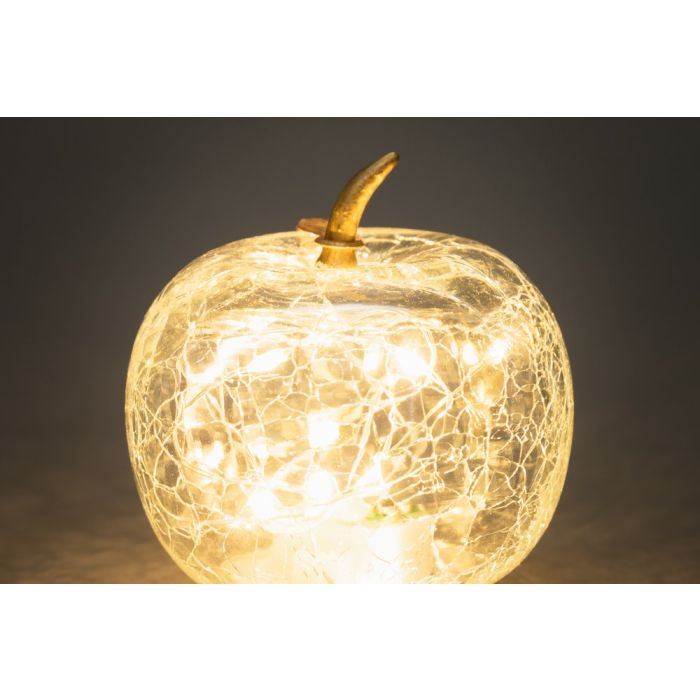 Skaists dekoratīvs ābols, kas izgatavots no caurspīdīga stikla. Ābola iekšpusē ir 10 silti baltas LED gaismiņas. Taimera funkcija: 6 stundas ieslēgts / 18 stundas izslēgts. Baterijas: 3 x LR44 (iekļautas). Tikai lietošanai iekštelpās.