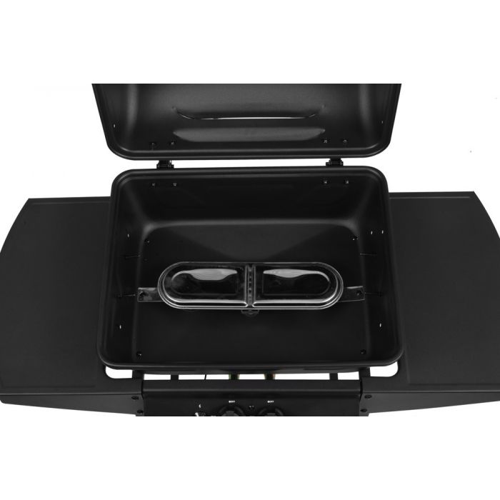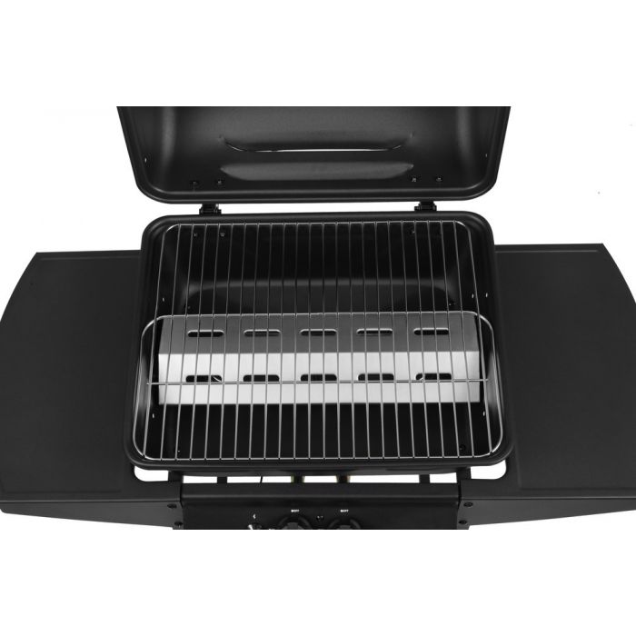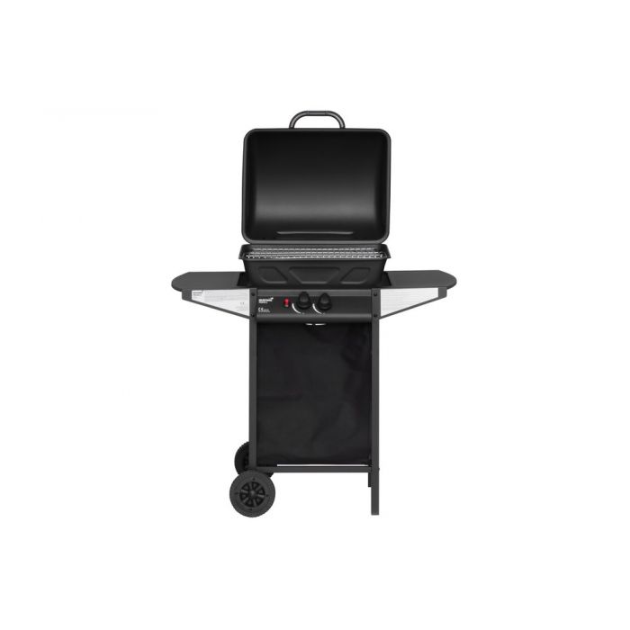 Gāzes grils ar diviem degļiem. Kopējā jauda 5,5 kW. Grila laukums 48,5 x 37,5 cm. 1 grila režģis 48,5 x 37,5 cm, izgatavots no hromēta tērauda. Vāks, kurtuve, vadības panelis, ratiņi un sānu galdiņi no pulverkrāsota tērauda. Audekla priekšējais panelis. 2 lieli riteņi ērtai transportēšanai. Piemērots grila pārsegs 602300. Garantija 2 gadi.