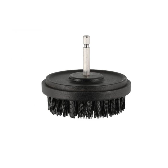Grila tīrīšanas birste urbjmašīnai. Neilona sari. Jaudīga tīrīšana. Birstes diametrs 10 cm. 1/4″ savienojums urbjmašīnai.