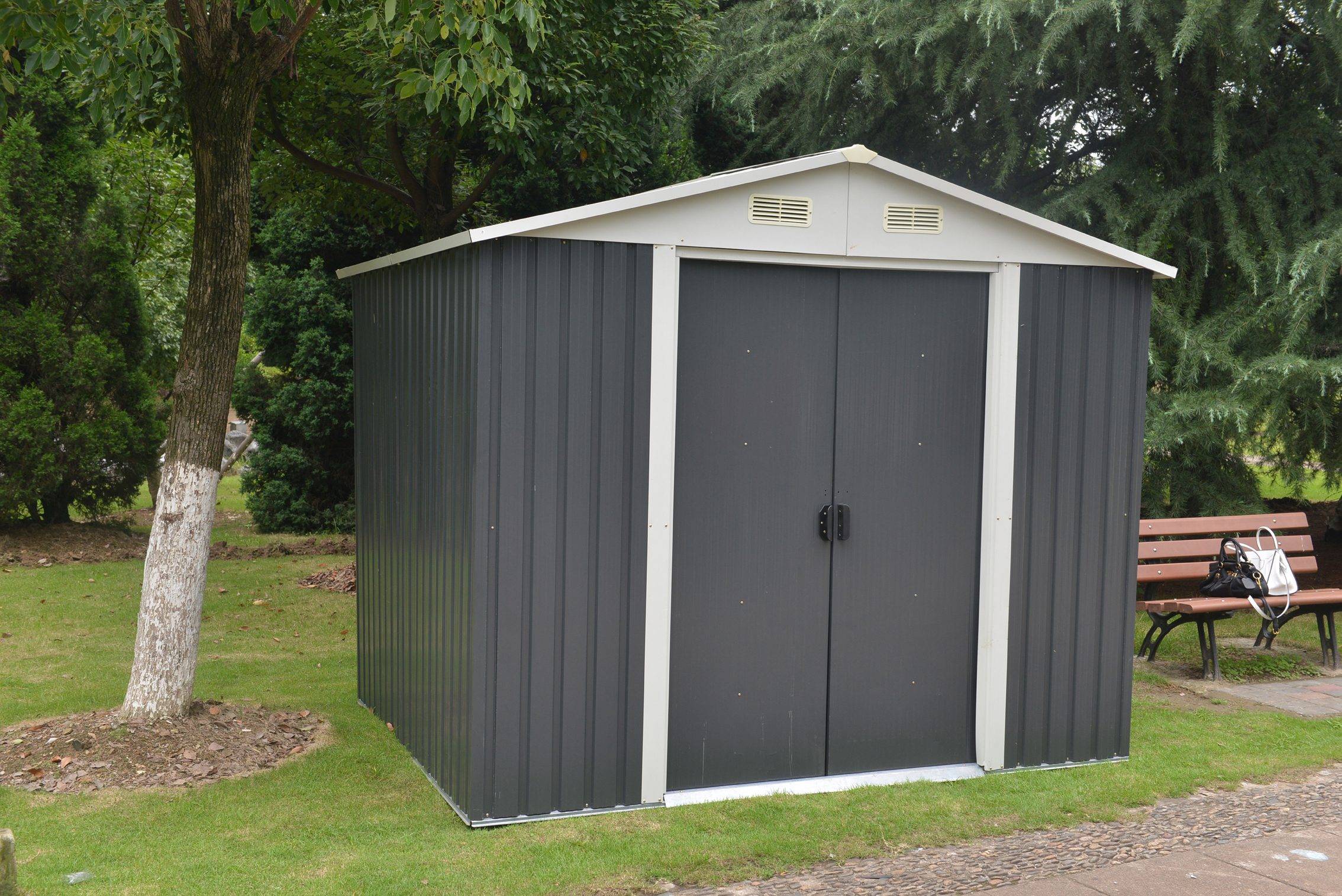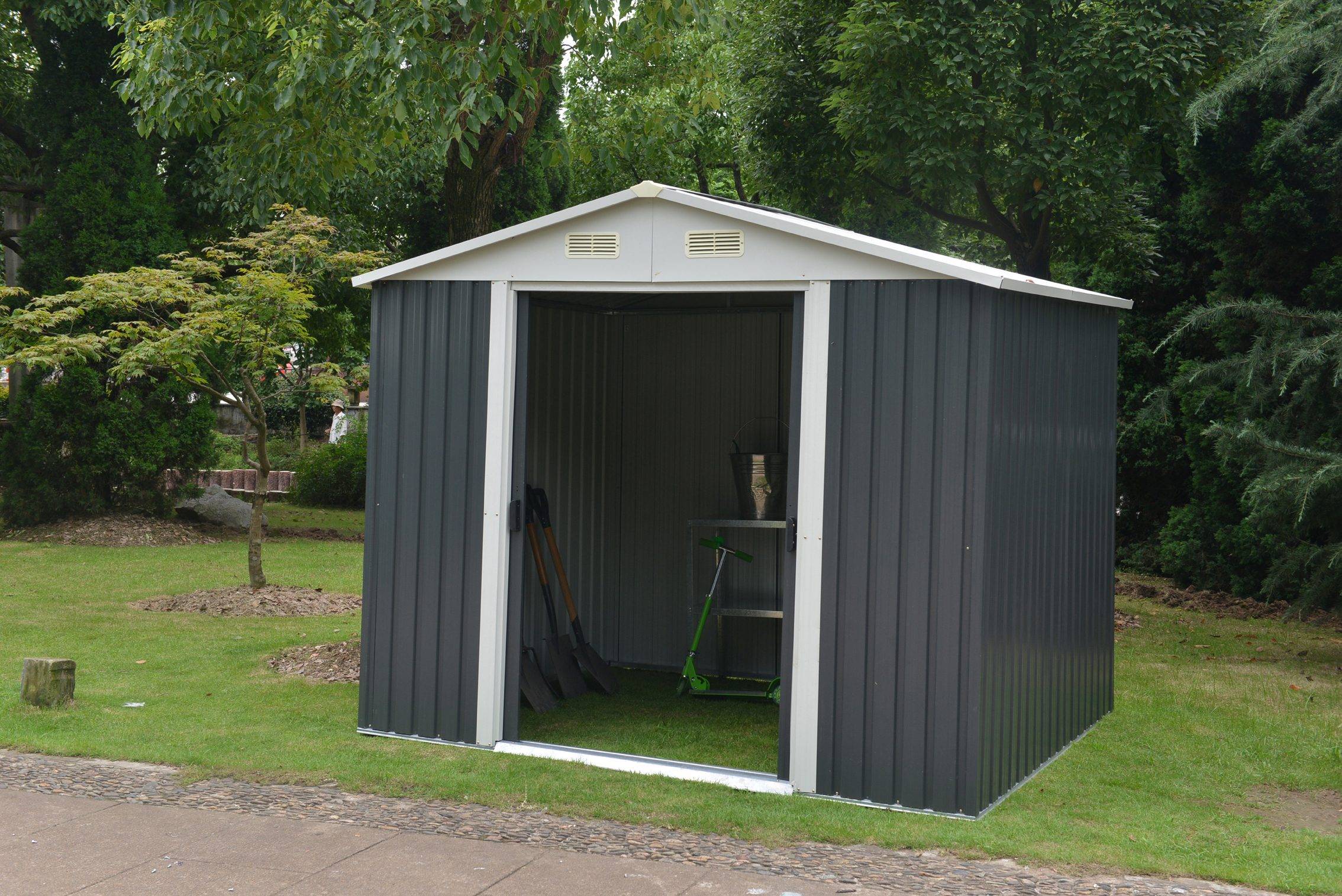 Tarmo dārza šķūnīša vienkāršais dizains lieliski iekļaujas Jūsu dārzā. Šķūnītis ir ideāli piemērots darbarīku un dārza piederumu uzglabāšanai, iespējams uzglabāt neliela izmēra transportlīdzekļus. Ražots no metāla ar izturīgu tērauda rāmi un tērauda paneļu sienām. Šķūnim ir bīdāmas durvis, ventilācijas atvere priekšējās un aizmugurējās sienās, kas nodrošina labu gaisa cirkulāciju. Šķūnīša izmēri 260 x 258 x 202cm. Durvju augstums ir 163cm, platums – 95,5cm. Sienas biezums 0,25mm, rāmja biezums 0,6mm.