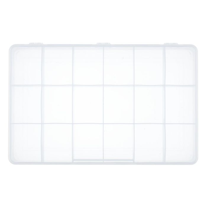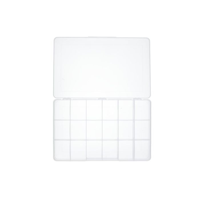 Daudzfunkcionāls organizators ar 18 nodalījumiem skrūvēm, uzgriežņiem u.c. sīkiem priekšmetiem. Caurspīdīgums palīdz viegli redzēt saturu.