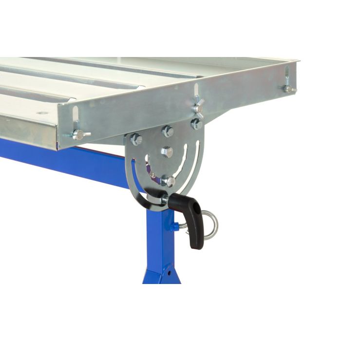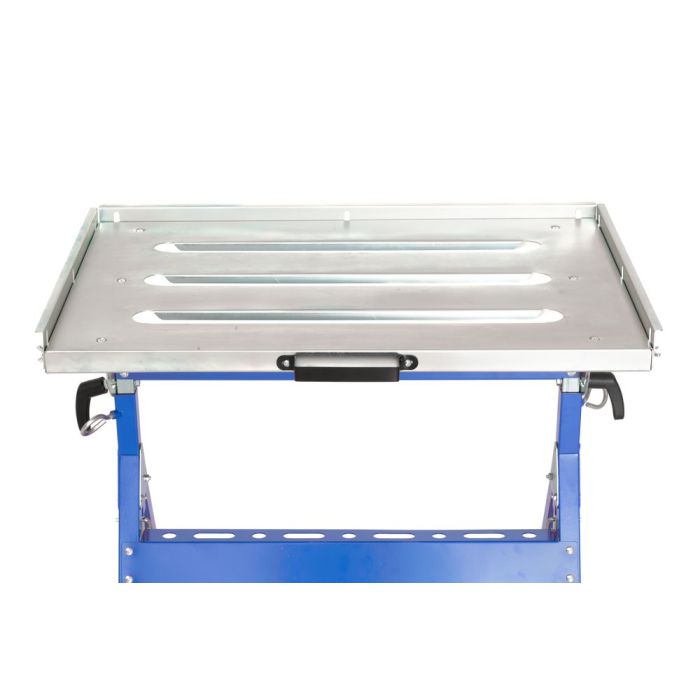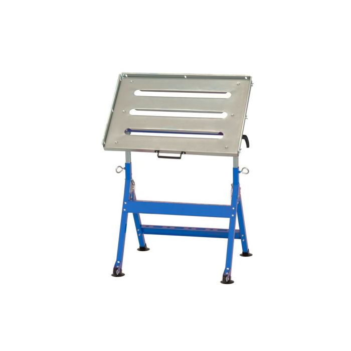 Salokāms un regulējams metināšanas galds. Darba virsmas augstuma regulēšana 780–930 mm, leņķa regulēšana 0–90 grādi. Salokāms nelielā telpā un ir viegli paņemams līdzi. Mazi riteņi un vilkšanas rokturis atvieglo pārvietošanu. Darba virsma no cinkota tērauda 760×510 mm. Maksimālā celtspēja 150 kg.
