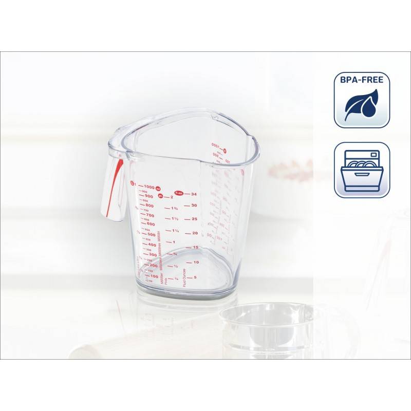 Ērtas formas un eleganta dizaina mērtrauks no izturīgas plastmasas. Ar viegli nolasāmu caurspīdīgu mērskalu. Var viegli nomērīt miltus, cukuru un šķidrumus. Ir iespējams mērīt arī starptautiskās vienības, piemēram, pintes kausus un šķidruma ounces. Ar šo mērtrauku sarežģīta mērvienību rēķināšana nav nepieciešama. Trauks aprīkots ar snīpīti, vieglākai šķidruma izliešanai. Ar neslīdošu gumijas pamatni. Nesatur BPA.