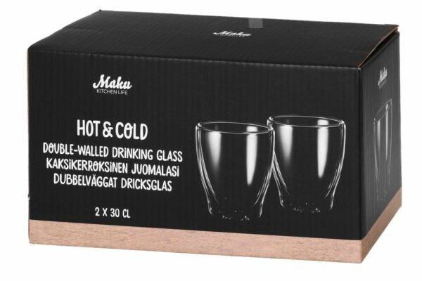 Maku dubultstikla glāžu komplekts, kas piemērots aukstiem un karstiem dzērieniem. Šīs dubutstikla glāzes karstus dzērienus uzturēs ilgāk karstus, bet aukstus ilgāk aukstus. Komplektā ietilpst 2 glāzes. Glāzes ir mazgājamas ar rokām. Kvalitatīvā materiāla dēļ tās saglabās ideālu caurspīdīgumu ilgu lietošanas laiku.